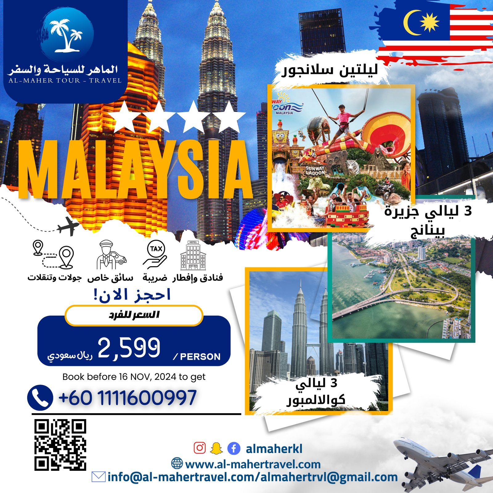 Take advantage of the amazing offer for a limited time only.. 2599 Saudi riyals per person for 8 nights (9 days), including the states: (Selangor - Penang Island - Kuala Lumpur). Includes 4-star hotel reservations - daily tourist tours - transfers between states - domestic flights - transportation to and from the airport.